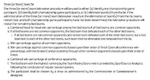 First and foremost, Duke needed to win their own game, an inter-state rivalry with Wake Forest University. They took care of that handedly, winning 49-32. #12 University of Miami destroyed #22 University of Pittsburgh, giving both teams two conference losses. On Saturday night, step three came to fruition, when University of California, Berkeley took down #21 Southern Methodist University (SMU), meaning that SMU had 2 conference losses, tied with Miami, Pitt, Georgia Institute of Technology, and Duke. Normally, a tiebreaker comes down to who wins a head to head matchup; however, according to the ACC tiebreaker policy, in a three or more team tie, there is a whole new set of rules that takes place: