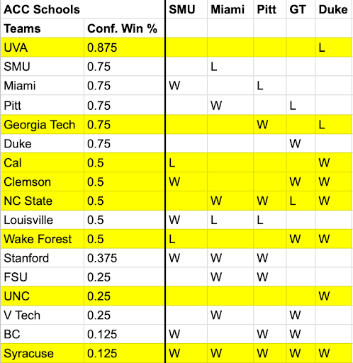 Take a look at the spreadsheet above, with Duke’s opponents highlighted in yellow. Duke’s opponents have an average conference win percentage of .500, with Miami and Georgia Tech tying for second with an opposing team average conference win percentage of 0.4375.